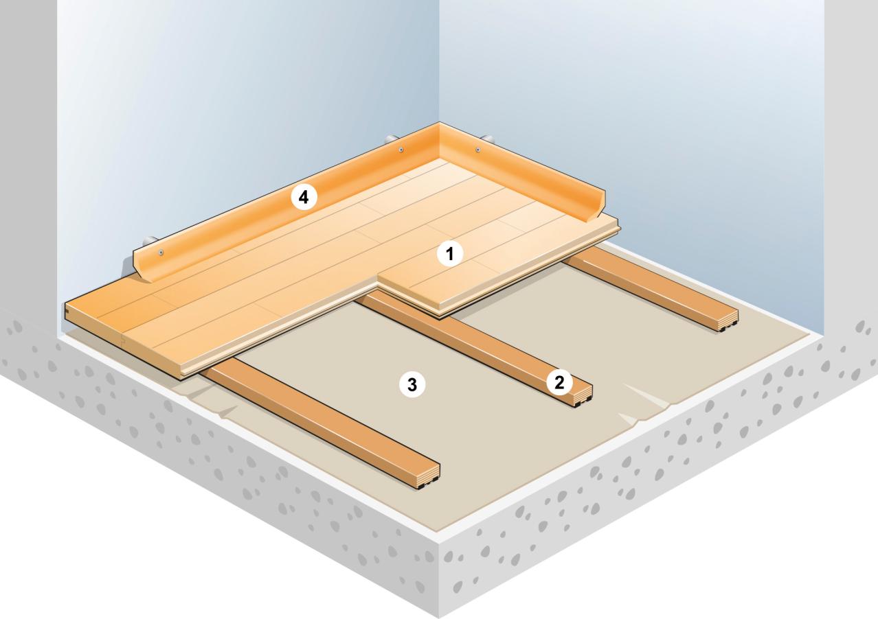 El sistema se compone de tablas de madera maciza de Junckers de 22 mm, clavadas sobre un rastrel de madera laminada, con un conjunto único de tiras de goma especialmente desarrolladas y preinstaladas en la parte inferior del rastrel. Estas tiras insertadas en forma de “U”, es un sistema elástico integrado, que evita la deformación. Esto garantiza que el sistema de rastreles ofrece una óptima absorción de impactos a largo plazo y un rebote de pelota consistente en toda la superficie del suelo.