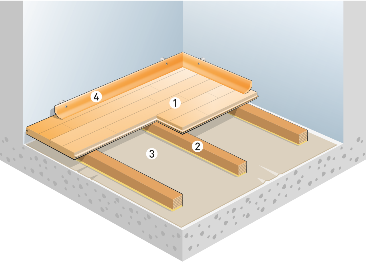 Las tablas de madera maciza de 22 mm se fijan a un sistema de subsuelo elástico formado por rastreles multilaminados montados sobre una capa continua de espuma amortiguadora.