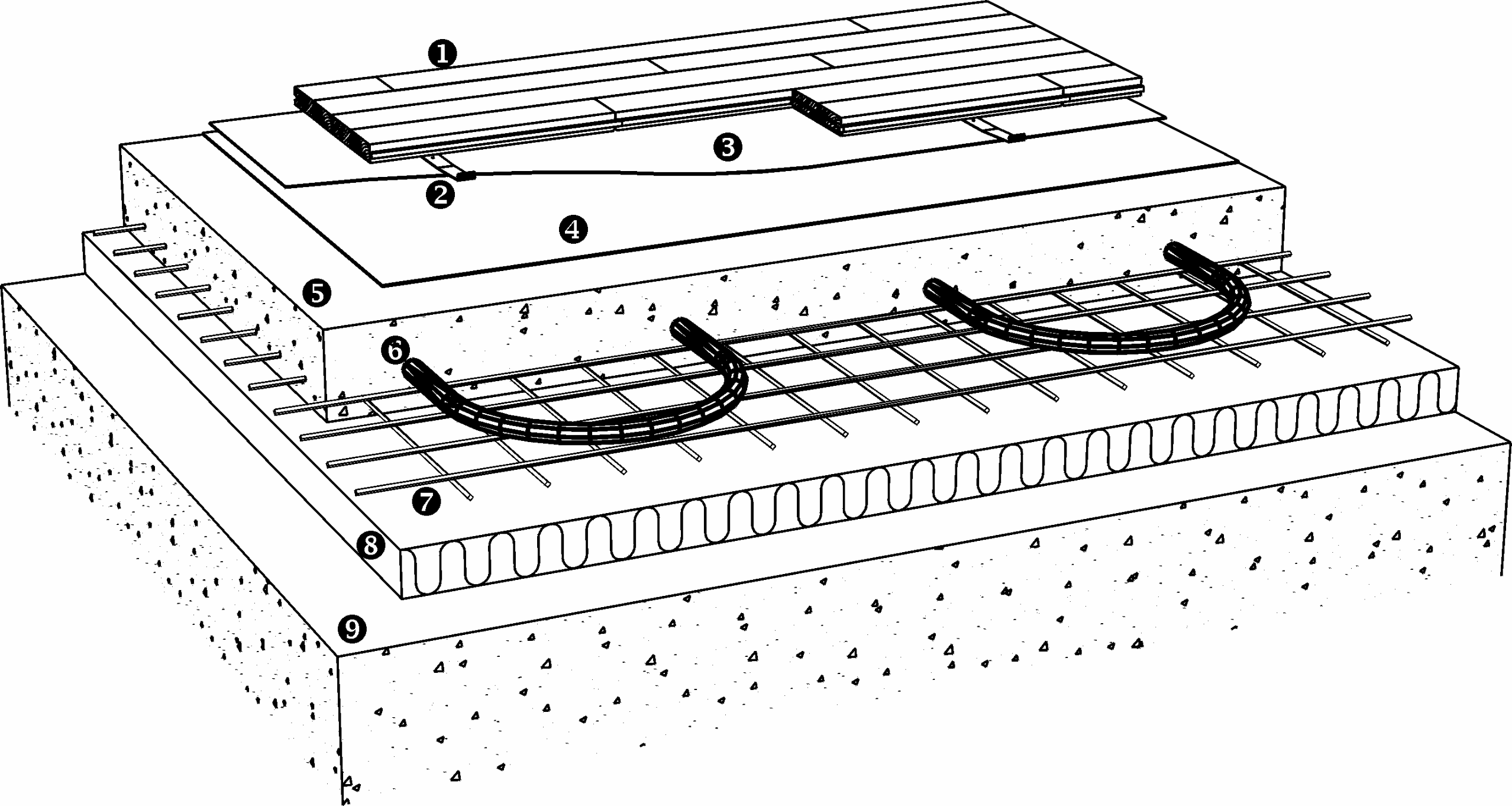 To ensure an even temperature distribution, on casting there must be min. 30 mm of concrete or screed above the heating pipes. The pipes should not be spaced more than 300 mm apart, and the cables not more than 150 mm apart.