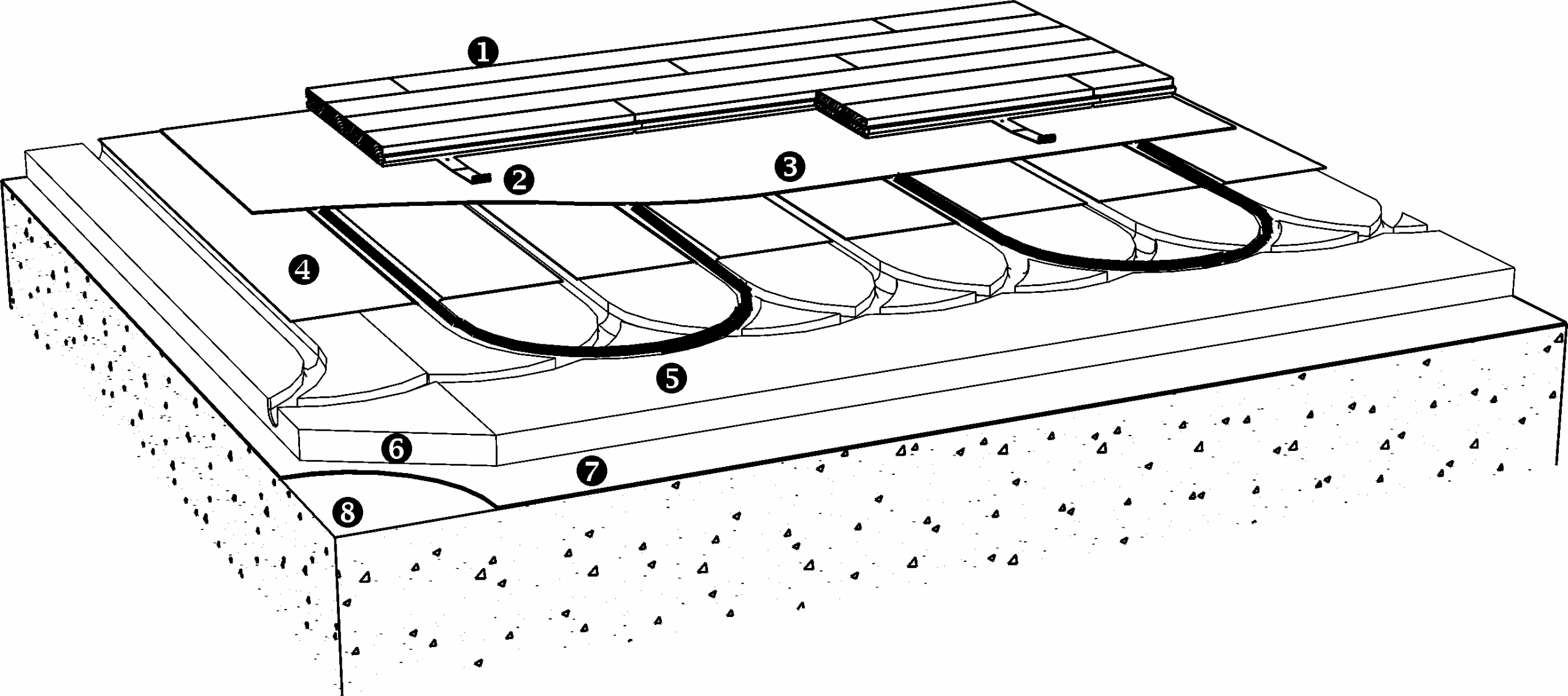 The clip system can be laid on concrete or screeded subfloors with cast-in heating pipes or cables. It is extremely important that the floor heating system is designed to achieve a stable temperature across the surface of the concrete or screed. The following applies to heating pipes in concrete or screeded floors:
