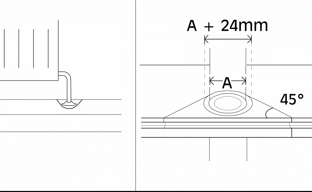 Alrededor de las tuberías, realice un agujero en la table para alojar la tubería. El espacio alrededor de la tubería debe ser el mismo que el espacio de dilatación dejado con la pared. Recorte una cuña cónica para poder pegarla en su sitio. Este espacio se cubre con un cobertor de tuberías de radiadores.