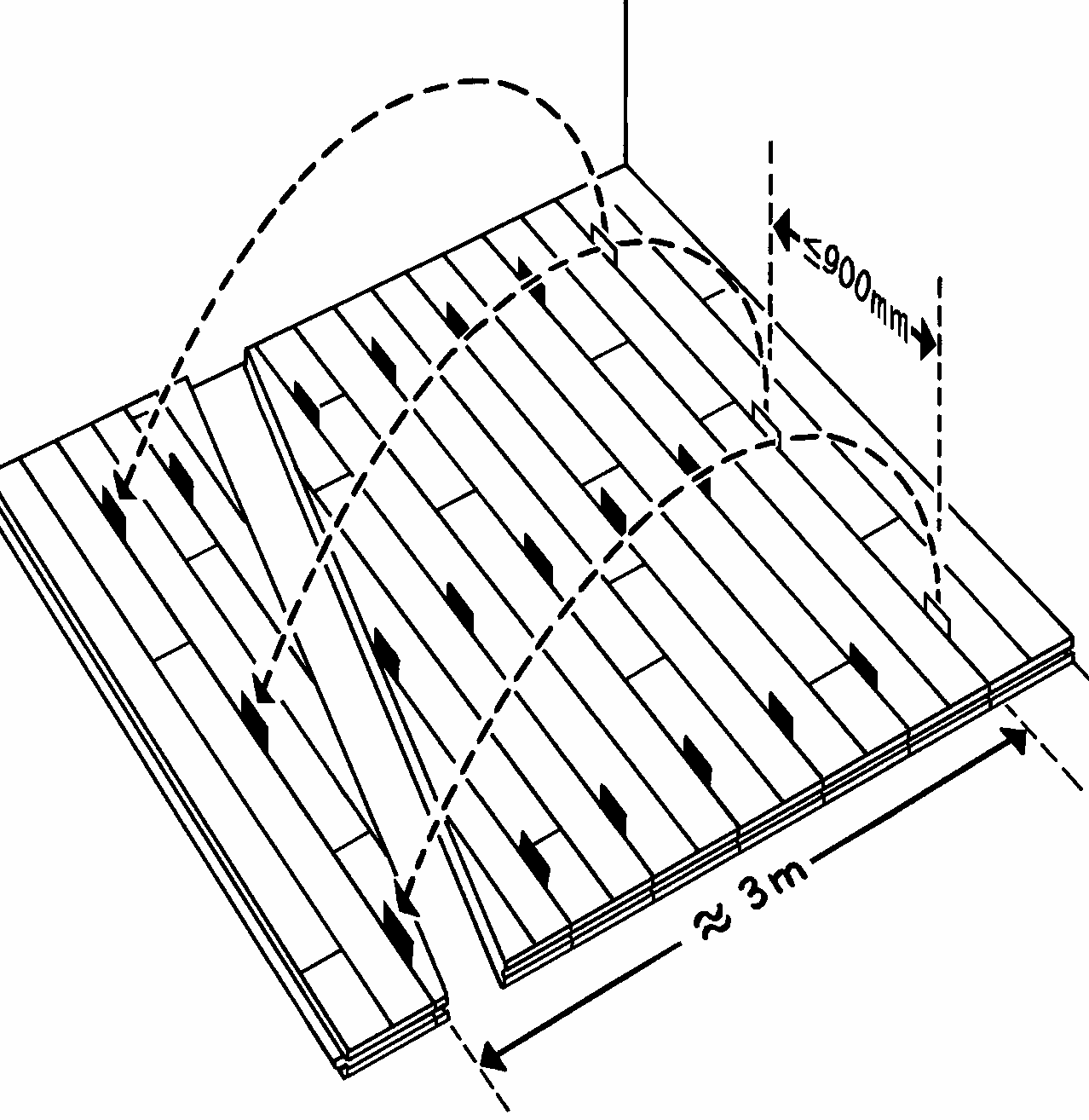 Instale las tablas siguiendo un patrón aleatorio. Distribuya las uniones de testa lo más separadas posibles. La distancia (A) entre uniones de tablas en dos filas sucesivas debe ser por lo menos 250 mm.