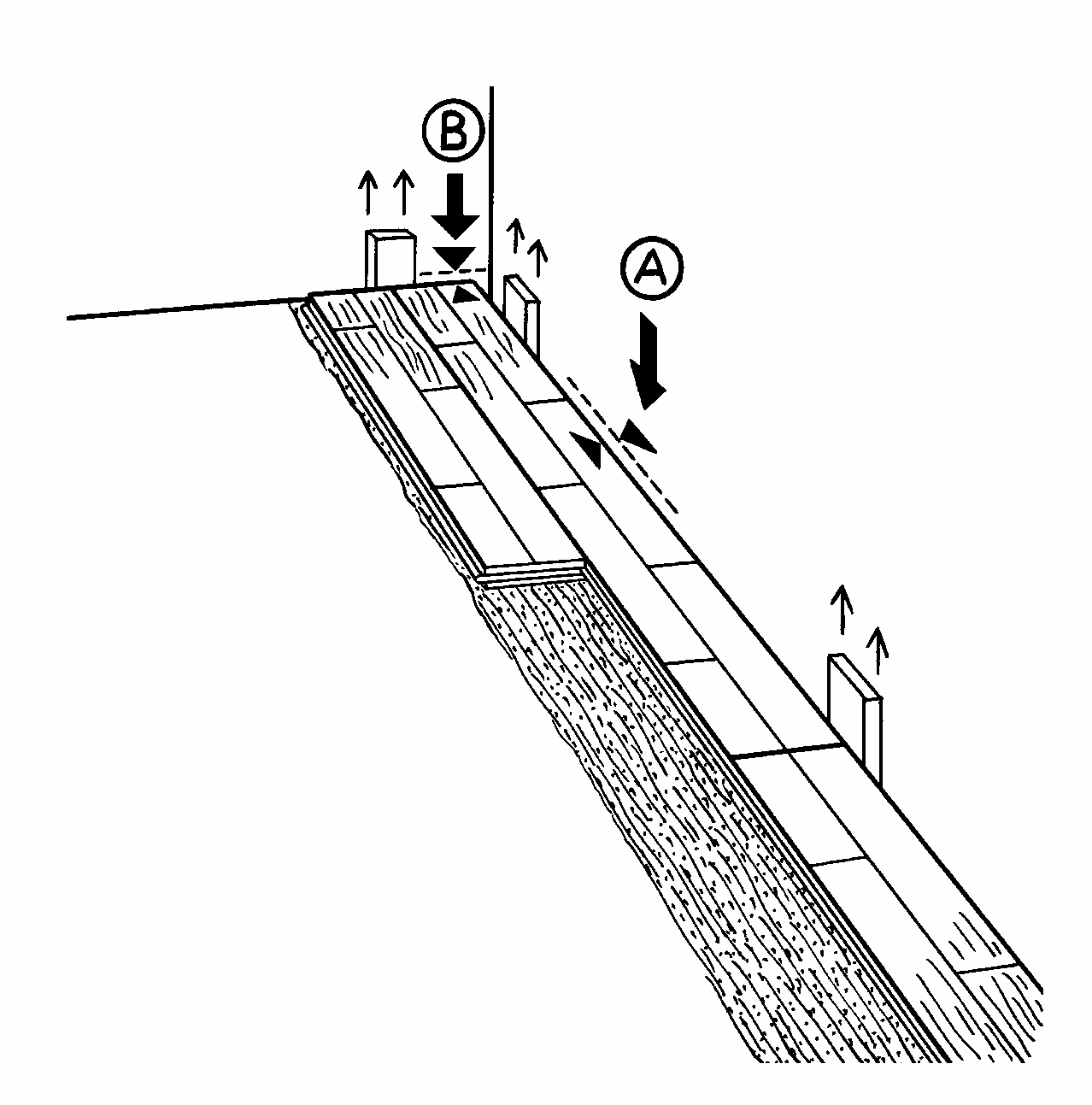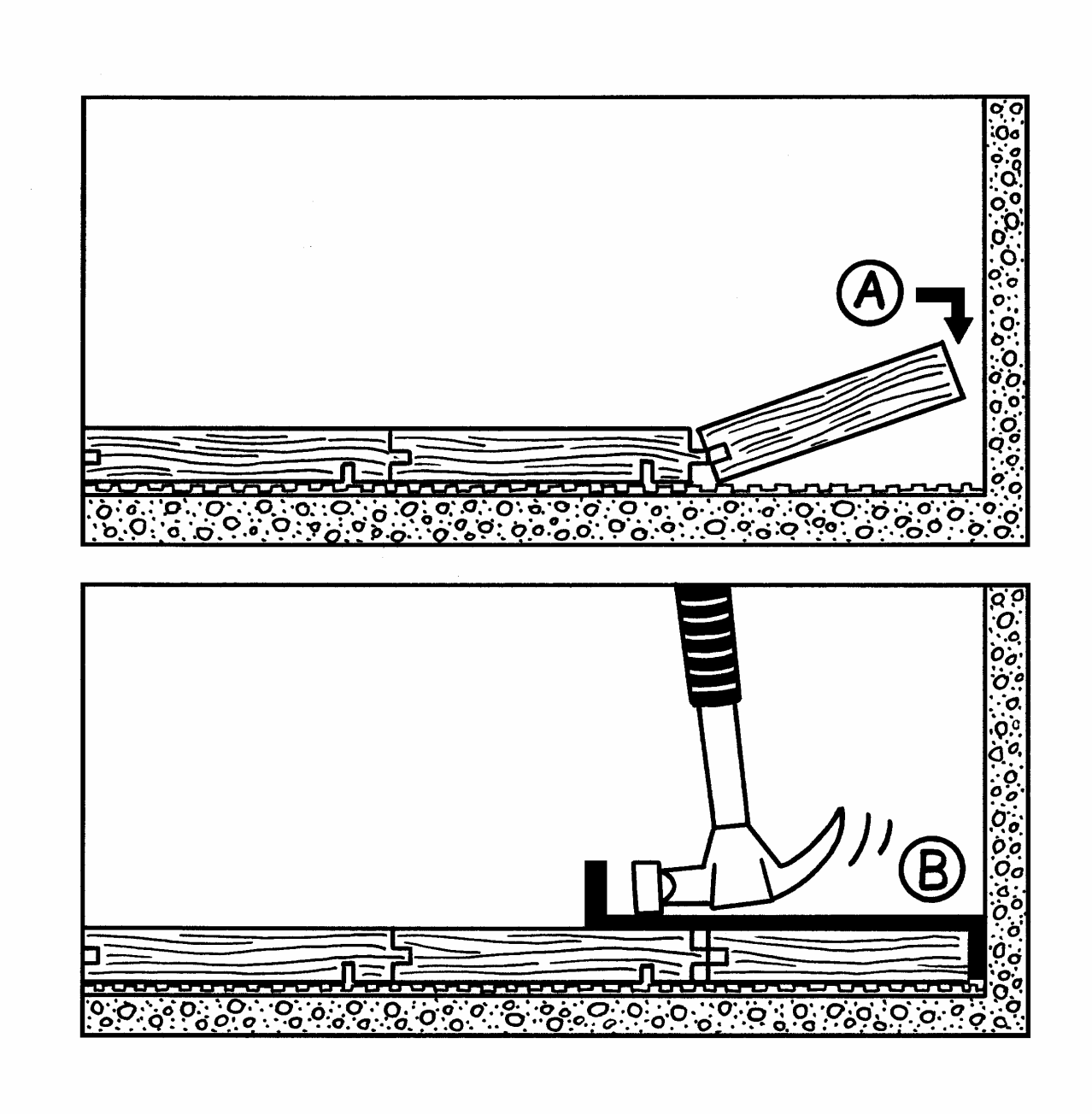 Corte la última fila de tablas hasta formar el tamaño correcto de la junta de dilatación en la pared. Utilice un martillo de carpintero (B) para encajar la última tabla en su sitio.