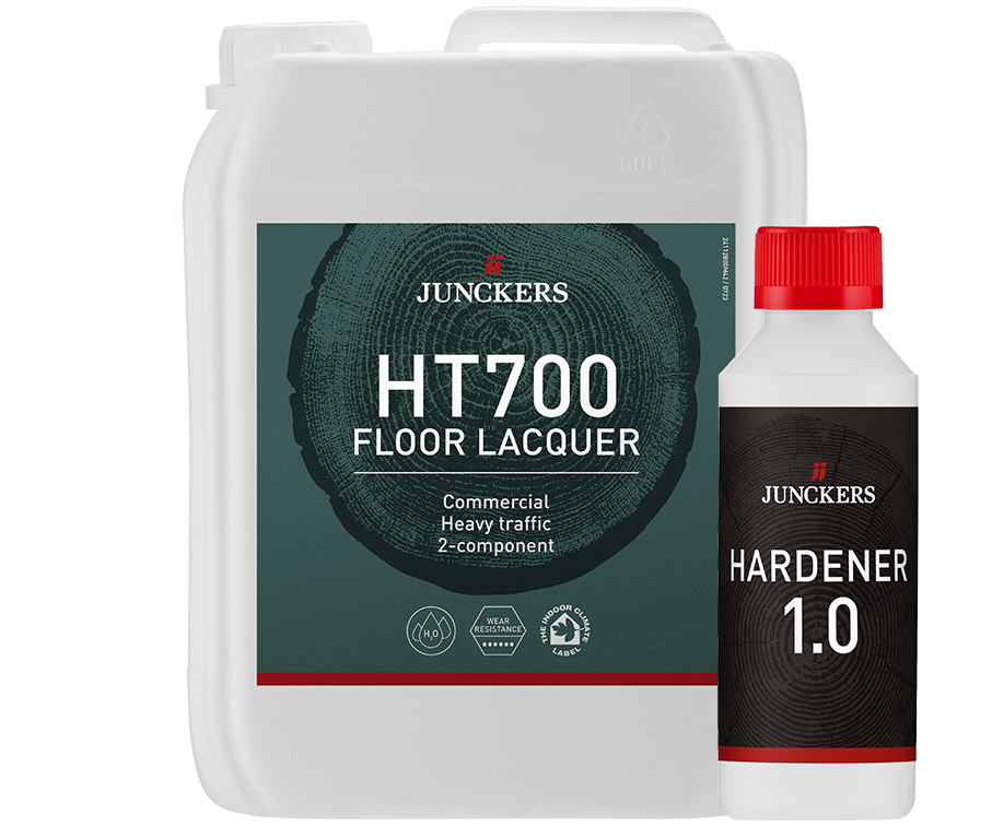 Al barnizar un suelo sin tratar o un suelo lijado a madera desnuda, utilice una de las imprimaciones de Junckers antes del sellado superior de acabado. HT700 Floor Lacquer debe ser mezclado con el endurecedor antes de su uso.